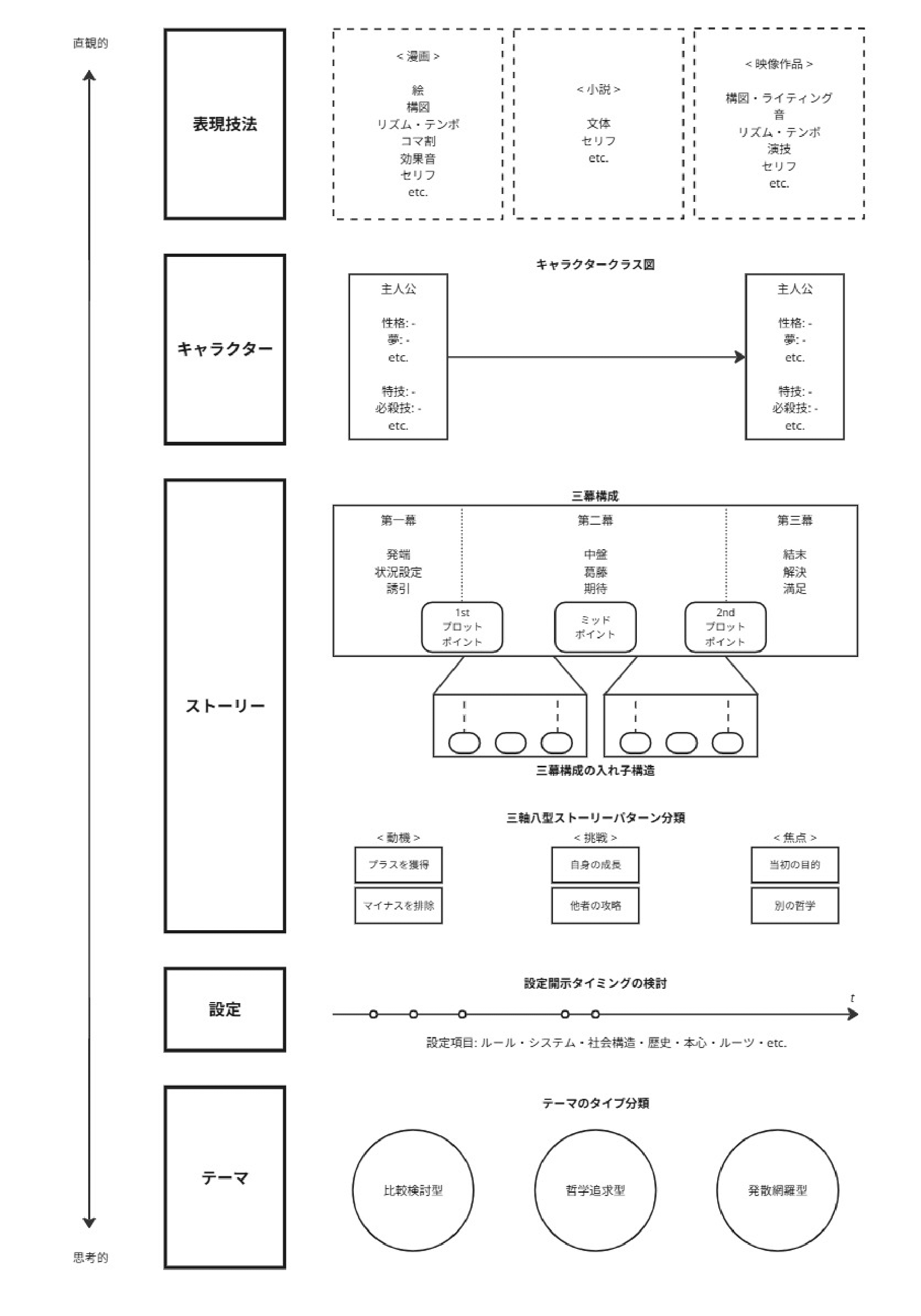 創作理論研究の現在地点の整理も兼ねて、物語要素構造図を作ってみた、という話では、物語の構成要素のモデルである物語要素構造図を提案しています。物語の構成要素を、直観的 ↔ 思考的の軸に沿ってモデリングすることで、「ツカミ」に向く要素・「ヒキ」に向く要素とを明確にしています。